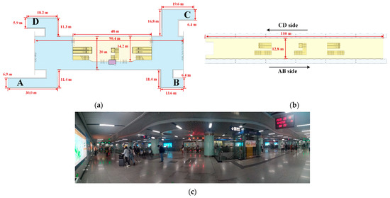 Combining the above selection criteria, the Sports Center Station on Line 3 of the Wuhan Metro is selected as the research object to illustrate the proposed method. This station has two spacious floors, the concourse floor and the platform floor, with a total area of 13,940 m2; the concourse floor has four exits with a height of 3.5 m, the platform floor is an island platform with the PSD system, the height of the platform is 3 m. More detailed parameters are given in Figure 2. The station has no interchange or other transportation attributes, and there are no connected underground businesses, with easy access to ground-level slow-moving traffic, and the vast majority of people entering the station are passengers.