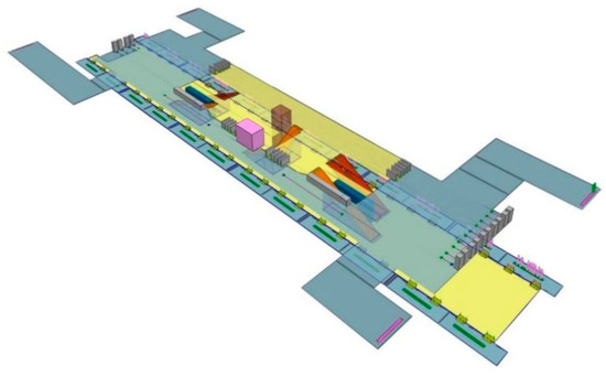 PFA is performed using the Massmotion software based on the social force model; the effectiveness of this software had been demonstrated in [20,21]. According to the floor plan of this station, The PFA model was built according to the floor plan of this station. Figure 3 shows the PFA model of the concourse floor.