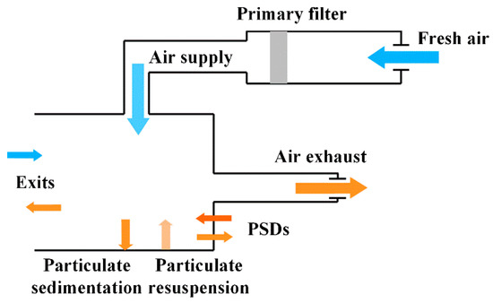 The airflow organization pattern in the station can be simplified to the following two states [23,24], one is the PSDs closed state (Figure 6a); when the train does not arrive, if the air leakage of PSDs are neglected, PSDs are well-sealed and the air inside the subway flows to the outdoor through the exits. The particulate matter generated in the tunnel by the train running and rubbing the track will not enter the platform [23]; the other one is the PSDs opened state (Figure 6b), since the low air pressure in the tunnel and carriages, the platform air flows to the tunnel and carriages. Meanwhile, the outdoor air enters the concourse floor. When PSDs are closed, the sources of particulate are air supply outlets, equipment, and pedestrians; but when the PSDs are opened, outdoor air enters so that the exits are also particulate sources, therefore, the two airflow organization states need to be simulated separately.