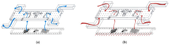 The modeling dimensions of the public area are 90.4 m × 20 m × 3.5 m (the concourse floor) and 110 m × 12.8 m × 3 m (the platform floor). The arrangements of supply and return air outlets in the two floors are shown in Figure 4, the air outlet sizes of the concourse floor and platform floor are 300 mm × 300 mm and 600 mm × 500 mm, respectively. This study is conducted during the non-air-conditioning season, so the outdoor temperature is lower than the supply air temperature, the outdoor air is sent directly to the concourse floor and platform floor after passing through the primary filter without cooling treatment, while the return air is all discharged to the outdoors, as shown in Figure 5 [23].