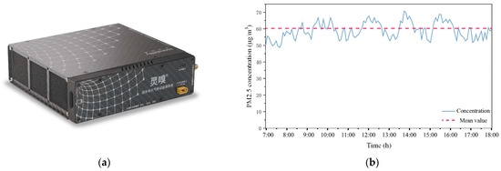 Sniffer 4D and Outdoor PM2.5 concentration measurement results: (a) Sniffer 4D instrument; (b) Measurement results of outdoor PM2.5 concentrations on 11 November 2020.