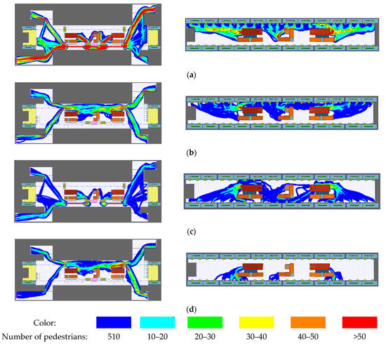 For the first purpose, the movement track of each pedestrian is available in the software. Meanwhile, the space utilization analysis of different directions of boarding and alighting pedestrians for the station’s concourse and platform floors can also be performed, which indicates the pedestrian’s choice of path. Figure 8 shows the space utilization analysis results for each subway trip. The closer the area to red, the higher the space utilization and the more concentrated the flow of pedestrians.