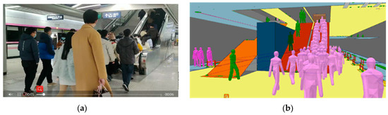 Observed and simulated pedestrian distribution at the stairway of the platform floor: (a) Observed result; (b) Simulation result.