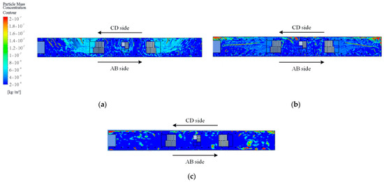 Simulation results of particle mass concentration contour at the station platform floor under different airflow organization: (a) AB side PSDs opened; (b) CD side PSDs opened; (c) PSDs closed.