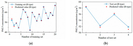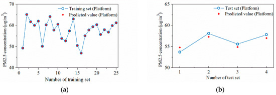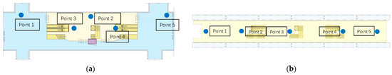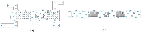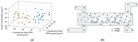 The establishment of the surrogate model is divided into the following two parts: the first step is to conduct a reasonable sampling to obtain the real particulate matter distribution in the station. In this paper, the measurement points are arranged based on the optimal-latin hypercube sampling (OLHS) method [29], this space-filling sampling method can capture the true concentration distribution characteristics of particulate matter with small samples set as fully as possible. Considering the long length of the concourse and platform floor, the space is divided into two parts in length for sampling, and 20 points are sampled in each part using the OLHS method. Besides, three sampling points are arranged in each passageway. After eliminating some sampling points that are not convenient for measurement, the sampling points at the concourse and platform floor are arranged as shown in Figure 15. Considering the limited experimental equipment, a ten-minute sampling was conducted at each point during the period of 9:00–13:00 on 11 November 2020, when the PM2.5 concentration was relatively stable, to obtain the PM2.5 concentration variation and solve for its mean value. The sampling results and the corresponding simulated concentration value at each sampling point are given in Appendix A.