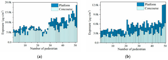 - To simplify the simulation model, the air leakage when the PSDs are closed is ignored in the CFD simulation; meanwhile, the particulate matter entering the platform from the tunnel and carriages when the PSDs are opened is also neglected. Thus, the particulate matter generated by the train operation is not appropriately considered, which results in the simulated concentration on the platform being lower than the actual measured value, which causes further errors in the exposure calculation. To further improve the calculation accuracy, it is necessary to build a more refined simulation model.