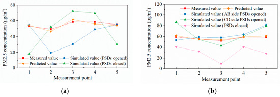 Measured and simulated PM2.5 concentrations at sampling points of the platform floor.