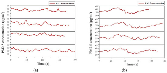 In Table 3, the particulate concentration at air supply outlets is set as the outdoor particulate concentration multiplied by the PM2.5 filtration efficiency of the ventilation system (40%), and the particulate concentration at the outlet is equal to the outdoor particulate concentration. The outdoor PM2.5 concentration is measured by the Sniffer 4D instrument (Soarability Technologies, Inc., Shenzhen, China) [26], as shown in Figure 7a; This instrument has a detection sensitivity of 0.1 μg/m3 for PM2.5 concentration measurement with a time interval of 1 s. Figure 7b shows the measurement results of outdoor PM2.5 concentrations at Exit A on 11 November 2020. The measurement points of outdoor PM2.5 concentration were arranged at the four exits and the wind pavilion of the station. Since there are no complex commercial buildings near the station, the terrain is gentle and the traffic flow is moderate, the daily average PM2.5 concentrations at the five measurement points were relatively consistent, about 61.5 μg/m3.
