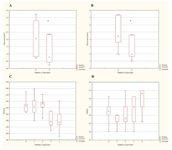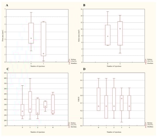 | Parameters | Number of Injections | Me | Q1 | Q3 | p < 0.05 |