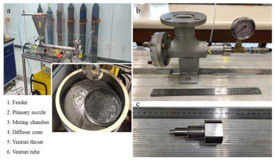(a) Photograph of washing ejector; (b) photograph of the cavitating device; (c) photograph of nozzle.