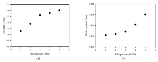 In order to evaluate the cavitation flow using the washing ejector, the inlet pressure was controlled using the flow control valves, ranging from 1 to 5 MPa gauge pressure. Figure 2 presents the flow rate and static pressure as a function of inlet pressure. The flow rate was 1.3 L/min for inlet pressure of 1 MPa, 2.6 L/min for 3 MPa, and 3.0 L/min for 5 MPa. With the increase in the inlet pressure, the static pressure difference increased from 0.007 bar to 0.01 bar. Eventually, the static pressure affected the cavitation flow in the washing ejector.