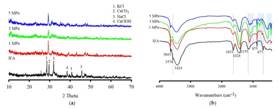 The spectrum of the original IFA exhibited bands at 3643 cm−1, 3570 cm−1, and 3424 cm−1 (O–H stretching). The bands at 3643 cm−1 and 3570 cm−1 are related to the stretching vibration of Ca-OH in Ca(OH)2 and the bending vibration of CaClOH. In addition, the band at 1633 cm−1 is associated with the vibration of the H-O-H band in the interlayer water [33]. The bands at 1424 cm−1 and 875 cm−1 are attributed to the presence of amorphous CaCO3 and calcite, respectively [34]. The bands around 1155 cm−1 and 677 cm−1 are related to the presence of sulfate [35]. After washing with IFA, the bands at 3643 cm−1 and 1633 cm−1 gradually decreased with the increasing fluid pressure, while the band at 1424 cm−1 increased and another band at 712 cm−1 appeared, corresponding to calcite. This result indicated that Ca(OH)2 gradually participated in the washing reaction and that much Ca(OH)2 transformed into amorphous CaCO3 in proportion to the increase in fluid pressure. Subsequent interactions with dissolved CO2 led to the formation of amorphous CaCO3. In contrast, the bands at 3570 cm−1, 1155 cm−1, and 677 cm−1 disappeared, which may be due to the solubility of the compounds. Simultaneously, the bands appearing at approximately 1100 cm−1 and 1040 cm−1 are related to the stretching asymmetric vibrations of Si, and the absorption peaks at approximately 786 cm−1, 532 cm−1, and 457 cm−1 are assigned to the bending vibrations of Si-O groups.