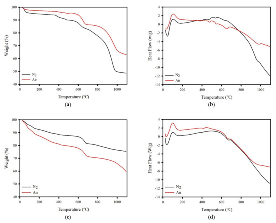 The TG and DSC curves of the IFA at a heating rate of 10 °C/min under an inert atmosphere of N2 and air are shown in Figure 4. The mass loss of IFA and washed IFA showed different trends with increasing temperature. TGA was conducted under N2 conditions to characterize the thermal behavior of the IFA, and a stage of sharp mass loss above 820 °C was found in the high-temperature region. This peak accounts for approximately 27.8% of the mass loss, whereas that of the washed IFA above 820 °C was 4.21%. The difference in the mass loss variation may have been caused by inorganic salts. Additionally, at temperatures above 650 °C in the N2 environment, the mass loss is mainly attributed to the thermal decomposition of CaCO3 in the samples and the formation of CaO when CO2 is released (Equation (11)). However, the mass loss variation of the samples in the air conditions showed different trends with increasing temperatures, as compared to N2. Based on the TG curves, the washed IFA mass significantly decreased until 600 °C, which can be attributed to the endothermic reaction. This phenomenon may be caused by the amorphous compound and decomposition of Ca(OH)2, i.e., Ca(OH)2 decomposed because it was present in the washed IFA, in agreement with the FTIR results.