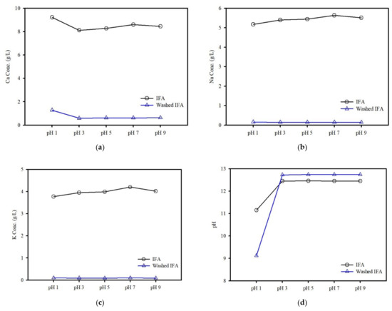 (a–c) Effect of the initial pH on the Ca, Na and K concentration leached from the IFA and washed IFA and (d) leachate pH at different initial pH.