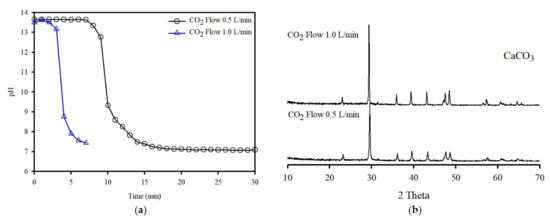 The washing effluent plays a major role in sequestration, providing an abundant quantity of Ca, and may be sufficiently reactive to be used as a medium for the formation of CaCO3. In this study, effluent carbonation was conducted to investigate the effects of the injection flow rate of CO2 on the precipitation process; the results are shown in Figure 7a. The CO2 injection was stopped at approximately pH 8.0, and the effluent attained a steady pH value. When CO2 was injected into the effluent, the pH decreased very quickly in the pH range of approximately 13.0–9.0; this indicates the completion of the carbonation reaction within this pH range. The form of CO2 is dependent on the pH of the aqueous phase, where the dominant species is CO3 [36]. When CO2 was taken into the effluent, the effluent lost its ability to buffer the pH, and the Ca then approached equilibrium.