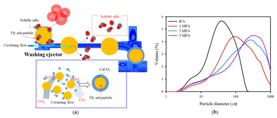 The primary objective of the pre-treatment was to determine the effect of removing inorganic salts in IFA using the washing ejector, followed by the prospect of a sustainable method of utilizing IFA. In the hydrodynamic cavitation using a washing ejector, a large number of water molecules diffused into the cavitation bubble. When the liquid was then subjected to a higher pressure, these bubbles collapsed, which can be attributed to the chemical reaction. The removal mechanism of the inorganic salts using a washing ejector can be summarized from the above results (Figure 8a). The inorganic salt-rich layer from the IFA can easily dissolve in cavitation bubbles. The soluble compound can be affected by collapse due to cavitation bubble formation during the washing process, and Ca release was accelerated to form aqueous CaCO3, which reacted with carbonates to generate precipitates under aqueous conditions. The main reason for this phenomenon is that the carbonates in the aqueous solution reacted with the released Ca ions to be deposited on the surface of the particles, indicating that the amount of amorphous CaCO3 gradually increased during washing (Equations (6)–(8)). These carbonates accumulated to form amorphous CaCO3, hindering the further dissolution of soluble compounds or trace elements, such as heavy metals, resulting in the inability to continue dissolution. Amorphous CaCO3 can be produced in the reaction, which can be explained by the particle distribution. The particle size distribution of the washed IFA was measured using a laser particle-size analyzer. As shown in Figure 8b, the median particle sizes (D50) were 108 µm, 161 µm, and 192 µm for fluid pressures of 1 MPa, 3 MPa, and 5 MPa, respectively. The washing ejector was accompanied by an increase in amorphous CaCO3, as well as a decrease in chloride content.