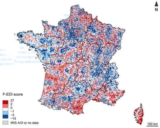 The geographical distribution of F-EDI scores in Metropolitan France is shown in Figure 2.