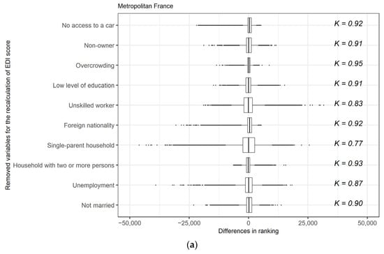 At the level of Metropolitan France, the IRIS ranking remained stable regardless of the F-EDI version used (Figure 3a). The lowest Kendall’s tau-b correlation coefficient was obtained with the recalculated F-EDI version without “Single-parent household” (K = 0.77), and the highest with the recalculated version without “Overcrowding” (K = 0.95). IRIS ranking was also stable with the recalculated versions of the F-EDI for the eight types of areas (Figure 3b,c). All the Kendall’s tau-b correlation coefficients were higher than 0.75, except with the recalculated F-EDI version without “Single-parent household” for type 6 (K = 0.70) and type 7 (K = 0.63).