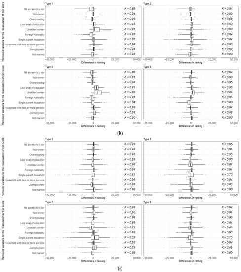 Kendall’s tau-b correlation coefficients and distribution of differences in IRIS ranking by removing components from initial version of F-EDI in Metropolitan France (a), and within the eight types of areas (b,c).