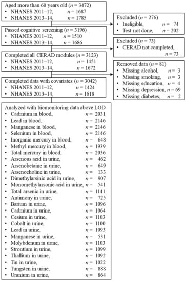 We obtained data from the 2011–2014 NHANES, a national survey assessing health and nutritional status administered to a multistage probability sample of the general U.S. population conducted by the National Center for Health Statistics (NCHS) of the Centers for Disease Control and Prevention (CDC) [29,30]. Participants completed surveys about demographics, health history, and diet, and they submitted blood and urine samples during physical examinations. Concentrations of metals and metabolites in the blood and urine were measured in a subsample following certified laboratory methods using sensitive instruments. In the NHANES 2011–2014, participants were randomly assigned into subsample groups A, B, and C and, based on the subsample group, the biomonitoring of environmental chemicals was performed [29]. The subsampling was necessary because one cannot obtain adequate amounts of blood in order to monitor all chemicals of interest, so different chemicals were measured among the different subgroups. The study protocol has been described previously [29]. The wordlist and learning module for immediate and delayed memory from the Consortium to Establish a Registry for Alzheimer’s Disease (CERAD) and for working memory from the Digit Symbol Substitution Test (DSST) were administered to adults aged 60 years and older who passed a cognitive function screening test [29]. The top-coded age was 80 years in the NHANES due to participants’ confidentiality. Hence, our study population included adults aged 60–80 years who passed cognitive screening tests and for whom metals and/or metabolites were measured in whole blood and urine samples.