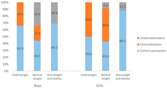 The results revealed that approximately half (48.6%) of the adolescents aged 15 and 17 years correctly estimated their body weight, with similar proportions for girls and boys. Every third teenager overestimated their body weight, whereas every fifth underestimated it. Overestimation was more prevalent in girls than boys; conversely, underestimation was more frequent in boys than girls. The results are in line with other studies conducted among adolescents [2,3,7,29,45,46,47].
