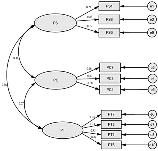 - Screening out questionnaire items whose loadings were above 0.5 in a few factors at the same time. Based on the above criteria, the three-factor model was extracted. The PT factor had four items; the PS and PC factors had three items. Cronbach’s alpha showed values above 0.65 for each factor, which indicated satisfactory correlations between a set of items as a group [68,69].