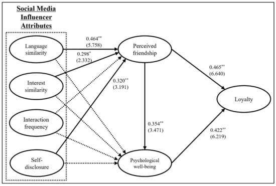 The authors adapted and revised multiple items to measure language similarity, interest similarity, interaction frequency, self-disclosure, perceived friendship, psychological well-being, loyalty, and perceived social responsibility of social media influencers. The authors invited two professionals to review the revised items and operationalizations of all constructs before conducting a pilot test. Next, the authors conducted a pilot test with 50 undergraduates at a public university in the United States, resulting in minor changes in the wording of some items and overall flow of the questionnaire, and then finalized the questionnaire. The participants were asked to respond to all questions with a 7-point Likert scale anchored by “1 = strongly disagree” and “7 = strongly agree” except for demographic characteristics. This study referred to the works of Su et al. [9] and Kim and Kim [3] to measure social media influencer attributes, consisting of language similarity (four items), interest similarity (three items), interaction frequency (four items), and self-disclosure (five items). Second, this study measured social media users’ perceived friendship with seven items from the work of Yim, Tse, and Chan [54]. Third, to measure psychological well-being, four items were adapted and revised from the work of Lee [55]. Fourth, the perceived social responsibility of influencers was measured with three items from Liu, Wong, Rongwei, and Tseng [56] (e.g., (1) “My favorite social media influencer supports nonprofit organizations working in socially problematic areas”; (2) “My favorite social media influencer contributes to campaigns and projects that promote the well-being of the society”; and (3) “My favorite social media influencer attempts to create a better life for others in need”). Lastly, this study operationalized loyalty with four items based on the work of Kim and Kim [57]. To avoid any issue with common method bias, the authors randomly ordered the survey items by employing a procedural remedy suggested by Podsakoff, MacKenzie, and Podsakoff [58].