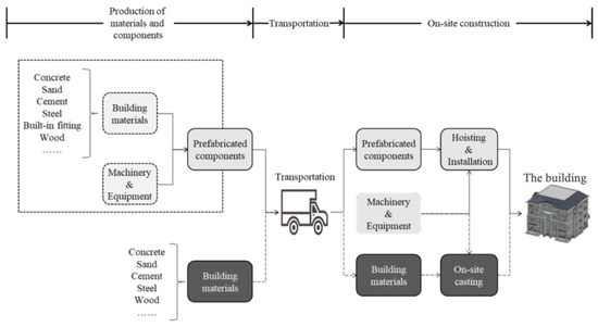 The entire life cycle of buildings includes multiple stages, such as the design, the construction, the operation, and the deconstruction. Note that this study focuses on the construction stage of prefabricated buildings. As shown in Figure 1, the whole construction stage can be divided into three phases: (1) the production of materials and components, (2) transportation, and (3) the on-site construction. This process division lays the foundation for carbon source identification.