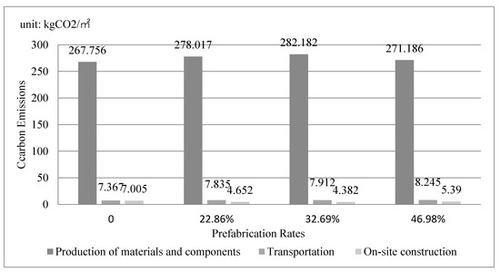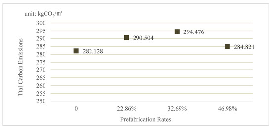The total carbon emissions of the case building under different prefabrication rates are shown in Figure 4. As can be seen, the carbon emissions per m2 of the case building with prefabrication rates of 0, 22.86%, 32.69%, 46.98% are 282.128 kg, 290.504 kg, 294.476 kg, and 284.821 kg, respectively. When the prefabrication rate is 0, the project is a traditional cast-in-place building.