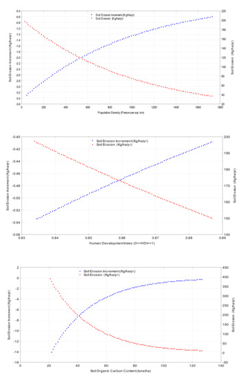 Equations (2)–(5) show an indirect relationship between the values of socio-economic variables (including population density, area-weighted average GDP, and human development index) and soil erosion rates on the national scale. Consequently, if the values of population density, area-weighted average GDP, and HDI increase, the soil erosion rate will decrease in the study catchments. A negative relationship between the human population and the rate of soil erosion has also been indicated by [16], which is consistent with the results of this study. However, the findings of [9] showed that food security is endangered by soil erosion on a global scale as the human population increases.
