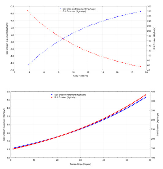 The plot of the incremental values of soil erosion versus the incremental changes in the values of the variable of interest (Figure 3) shows that the soil-erosion model does not have a uniform response by changing the values of the independent variables.