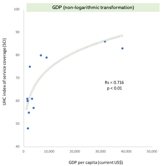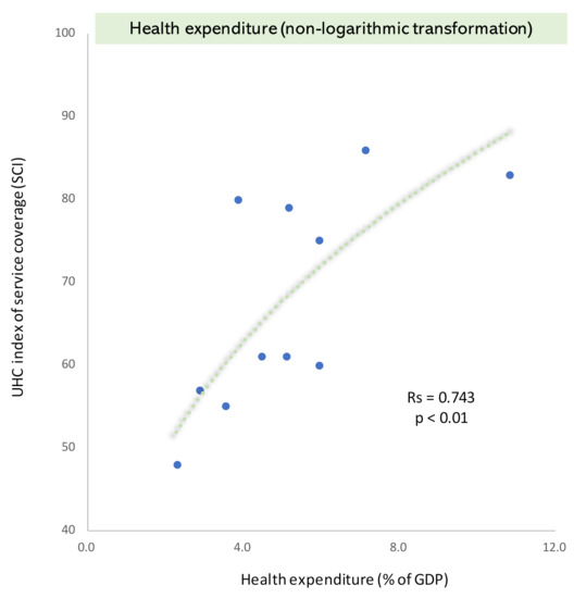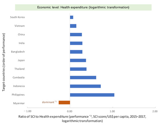 This study conducted a multifaceted analysis of the SCI to establish the relationship between UHC levels and economic factors. The research approach centered on a panel data analysis and performance analysis (CEA), and the findings obtained from this study do not exist in previous reports. As such, they have novelty and future potential. GDP and government health expenditures were significantly and positively correlated with SCI under a wide range of conditions inherent in the diversity between countries. However, the factors of unemployment and poverty were found to be negatively related to the level of SCI. In addition, “service capacity and access,” which refers to having a medical system with sufficient specialized facilities, medical staff, and health security, significantly contributed to SCI. This factor also had a close relationship with the GDP of each country. A performance analysis based on the ratio of SCI to the GDP/health expenditure showed that South Korea had the lowest performance, while the Philippines had the highest. Although long-term, stable economic growth is desired for UHC progress, the short-term analysis showed that Myanmar fell under the dominant category. Meanwhile, in the case of non-logarithmic conversion, we found that the performance value tended to decrease as aging progressed. Therefore, aging, which is closely related to the maturity of the medical system, also affects UHC [28,29].