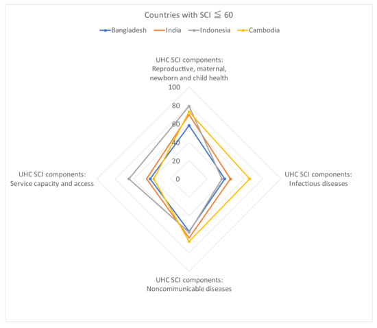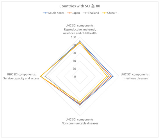 Distribution composition of SCI components by SCI level (60 or below and 80 or above). (†) China has an SCI of 79, but it is shown because it is as close as possible to the relevant group. Note: SCI, service coverage index.