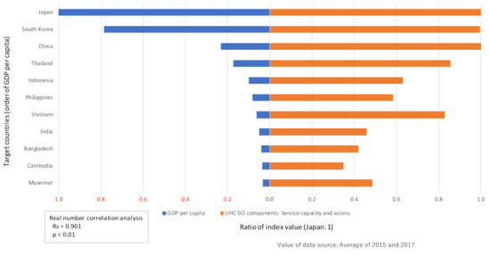 Each of the four SCI components had different achievement levels (Figure 2). LMIC are the majority among countries with an SCI level of 60 or below (Bangladesh, India, Indonesia, and Cambodia), where “infectious diseases” and “service capacity and access” were more widely dispersed. This was compared to the group of countries with SCIs of more than 80 (South Korea, Japan, Thailand, and China), which were HIC and UMIC. The multiple regression analysis using the annual rate of change in SCI as the objective variable and the annual rate of change in SCI components as the explanatory variable showed that “service capacity and access” was a factor that significantly contributed to the SCI level (standardized partial regression coefficient, 0.9209; partial regression coefficient, 0.3581; 95% CI, 0.3142–0.4019) (Table 3). The ROC curve for health expenditure per GDP for SCI showed a cut-off of 3.7% (p < 0.01) for the Youden index and 4.9% (p < 0.01) for the shortest distance (AUC = 0.8125, 95% CI: 0.6350–0.9899, p < 0.05; Figure S2). Furthermore, when the GDP per capita and “service capacity and access” values of each country were relatively arranged, with Japan as the standard, a positive correlation was observed between the two indicators (single correlation: Rs = 0.901, p < 0.01) (Figure 3).