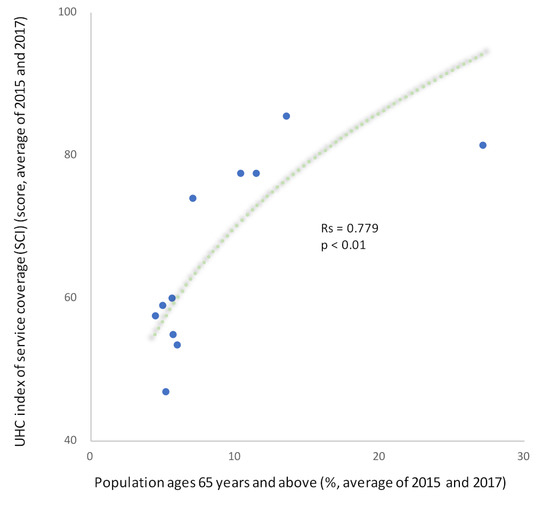 In this study, the interrelationships between SCI and major socioeconomic indicators were analyzed using a multifaceted method. First, we established the relationship between SCI and socioeconomic indicators using Spearman’s rank correlation, multiple regression analysis, and panel data analysis. The objective variable was the SCI, whereas the explanatory variable was the socioeconomic index in the panel data analysis. The fixed effects model, which eliminates individual-specific effects was used. We also applied a logarithmic transformation to adjust the elasticity and distribution characteristics in the regression analysis. To discuss the sensitivity of economic investment to UHC, we performed an ROC curve analysis of health expenditure and the SCI, with a score of 70 points as the criterion.