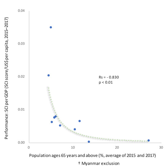Performance analysis after the logarithmic transformation of each index showed that South Korea (HIC) scored the lowest (GDP: 0.12 SCI score/USD per capita, health expenditure: 0.07 SCI score/USD per capita) (Figure 4), while Vietnam (LMIC) and India (LMIC) ranked next. Japan’s (HIC) performance was moderate, and Indonesia (UMIC), Thailand (UMIC), and Cambodia (LMIC) had relatively high performances. The Philippines (LMIC) had the highest performance (GDP: 1.84 SCI score/USD per capita, health expenditure: 1.04 SCI score/USD per capita). In addition, Myanmar (LMIC) was marked as the “dominant quadrant.” In the cost-effectiveness analysis, the quadrant that is more effective but less expensive has the best performance. When the relationship of the proportion of the population aged 65 and above was organized without logarithmic conversion, the SCI score increased with the aging of the population (Rs = 0.779, p < 0.01), and performance value decreased (Rs = −0.830, p < 0.01) (Figure 5). The relative performance due to health expenditure was similar to that of SCI (Rs = 0.842, p < 0.01) (Figure S3).