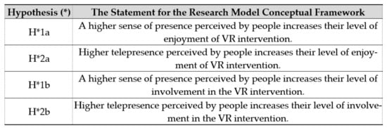 The conceptual growth of the research model alluded to in prior works was demonstrated [42]. The research model is mostly built on the basis of a few models [33,43,44] to link the concept of presence with an affective-motivational state, a VR experience, and psychological well-being. Figure 1 shows the four-layer theoretical framework for its potential usefulness and benefits in mental health. It found the relevant conceptual basis for the positive effect, such as the affective-motivational status of a VR intervention. Researchers reported that a higher sense of presence in VR journalism leads to greater enjoyment and involvement [45]. Researchers found that a person exhibits involvement and entertainment when using a VR game to learn, specifically an objective, i.e., a game destination in digital interaction [46]. Hence, even if it is not in a real-world, but in the real digital virtual world, a person may experience being present. This experience is associated with the sense of enjoyment and involvement of a virtual environment when a person is watching VR (Figure 2). Yang et al., 2021 investigated the research framework, which was based on a model with the following hypotheses [42]: