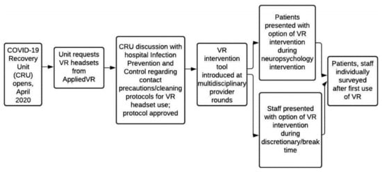 A flowchart describing the implementation of the VR tool within COVID-19 in a COVID-19 recovery unit (CRU). Reprinted from Kolbe et al., (2021) [64], Copyright (2022) with permission of Elsevier.