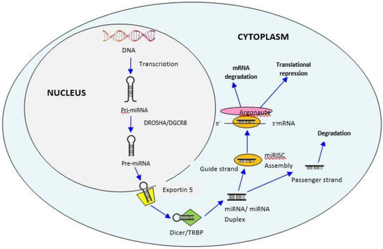 The biogenesis of miRNAs is a process for producing mature miRNAs, which takes place in the cell nucleus and cytoplasm. The process initiates in the nucleus, where the non-coding part of the host genome is transcribed by RNA polymerase II to produce a long hairpin-like structure of primary miRNA (pri-miRNA) having more than 200 nucleotides in length. Then, RNase III family enzymes Drosha and DGCR8 complex (DiGeorge Syndrome Critical Region 8) cropped the pri-miRNA into precursor miRNA (pre-miRNA) consisting of approximately 70 nucleotides [8]. Next, the pre-miRNA hairpin loop is transported into the cytoplasm by exportin-5. In the cytoplasm, the complex of Dicer and Trans-Activation Responsive RNA-Binding Protein (TRBP) cut the hairpin-like structure and processes the pre-miRNA into unstable 14–21 nucleotide long duplex miRNA structure and separated into two strands, mature miRNA guide strand and the miRNA passenger strand. After strand separation, the guide strand (5′end) of the miRNA/miRNA duplexis combined with the RNA induced silencing complex (RISC) attached with Argonaute protein which then interacts with the 3′ un-translated region (3′UTR) target site of the mRNA leads to the translational repression and mRNA degradation. In contrast, the passenger strand is often degraded. As miRNAs can affect multiple RNAs, a single miRNA can potentially impact numerous regulatory functions [9] (Figure 1) [10].