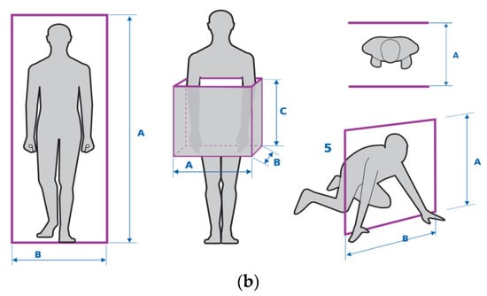 The terms used in the context of occupational safety in the European standards include “height and width allowances” and “minimum gaps” (safety distances). The standards EN 547-1:1996+A1:2008 [] and EN 547-2:1996+A1:2008 [] address the need to add height or width allowances (or both) to anthropometric data in determining the dimensions of passages and access openings. These allowances take into account cases such as fast walking, running, wearing heavy footwear and work clothing, as well as the use of PPE.