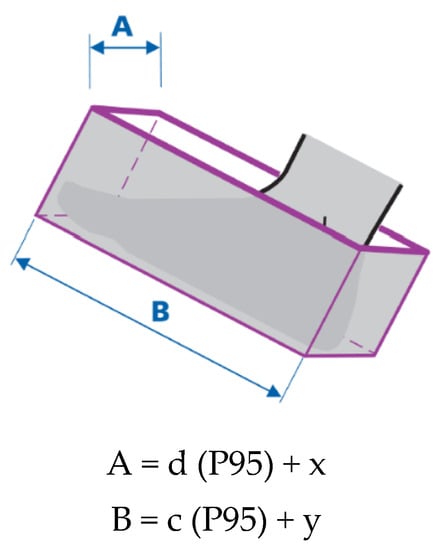 In the standard EN 547-2:1996+A1:2008 [], a cuboid is used to describe the dimensions of the human body, e.g., a foot within an access opening (the minimum space required for a foot to enter an opening up to the ankle bone, taking into consideration width and length allowances). An illustration showing directions for the design of access openings for one foot is given in Figure 2.