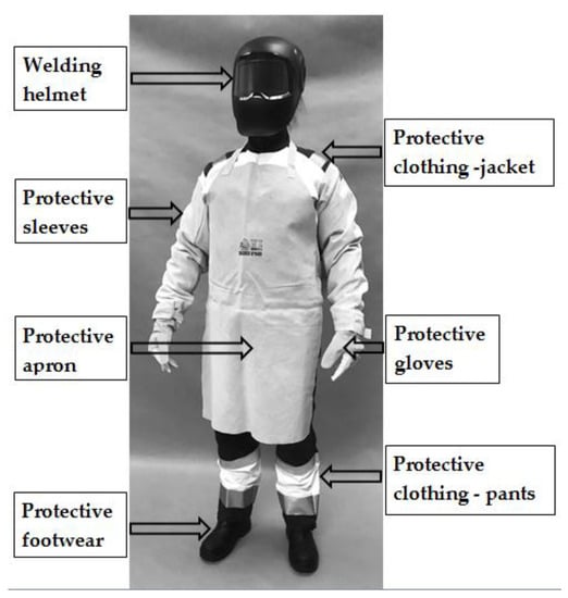 The hazardous and harmful factors in welders’ work environments include those of a mechanical, physical, and chemical nature, and in particular electrocution, extremely high temperatures and fire, molten metal splashes, hot workpieces (potentially causing limb, face, and neck burns), metal particles, sparks, and drops (risk of eye and face injury). Other hazards include the risk of mechanical injury to the arms, legs, and the whole body (due to falling structural elements, slips, etc.), harmful radiation, and work under poor lighting conditions, dust, poisonous and noxious chemical compounds, and explosion risks [,].