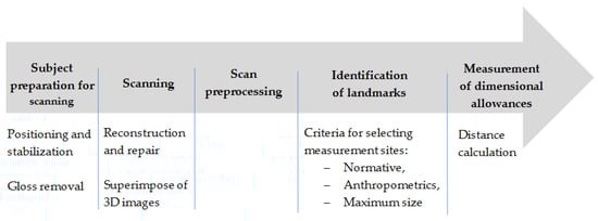 The standard procedure for determining dimensional allowances consisted of five basic steps. The first step involved subject preparation (the subject needs to be positioned in the same, repeatable posture and the PPE surface must be matted). After scanning the subject (step two), the obtained image was preprocessed (scan repair and superposition of the images of subjects wearing underwear and PPE). Subsequently, measurement landmarks were identified (step four), according to the adopted criteria: normative, anthropometric, and, most importantly, the maximum silhouette size (step five). A flowchart of the general procedure for determining dimensional allowances is given in Figure 4.