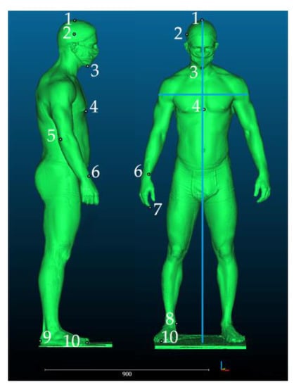 After preprocessing (repair and artifact removal), scans were imported to CloudCompare software. The next step involved the selection of anthropometric landmarks–external points demarcating the maximum dimensions of the human silhouette. At the same time, the distances between the landmarks constituted the minimum dimensions of geometric solids in which the silhouette could be inscribed. Figure 5 shows the selected landmarks.