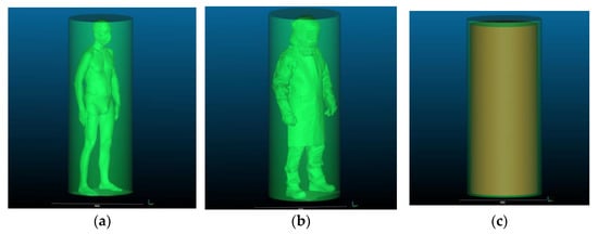 Cylinder dimensions were determined on the basis of the following maximum dimensions: in the X axis–the maximum distance between the shoulders (half of that distance is the cylinder radius), and in the Y axis–the maximum height of the human body, which is the height of the solid. In the case of the cuboid, the human silhouette was modeled using segments in three axes (x, y, and z); the base of the cuboid was defined by segments x (depth) and z (width), and its height by segment y.