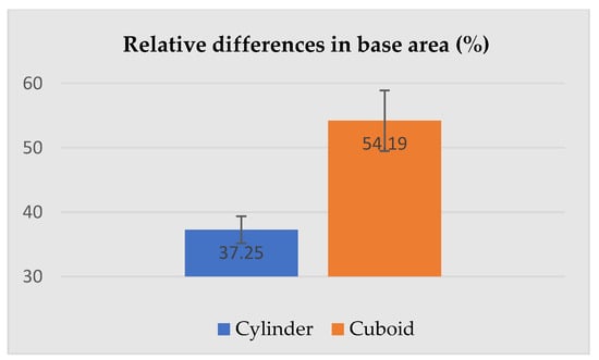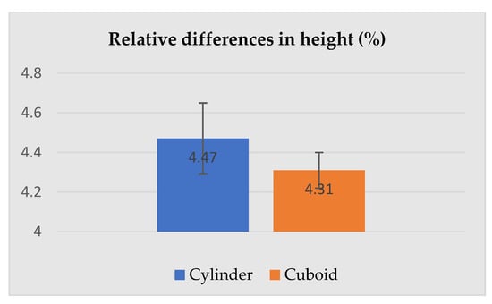 The dimensions presented above were used for the calculation of the relative differences (increase) between the selected dimensions of the geometric solids corresponding to the human subject wearing underwear and PPE. The most important parameters describing cylinders and cuboids, i.e., height, base area and volume are given in Figure 8, Figure 9 and Figure 10.