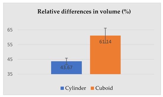 The relative differences in height and the base area between the subjects in underwear and PPE were similar (higher for the cuboid), also the relative difference in volume (see Figure 10) 0 was significantly greater for the silhouette described by the cuboid (61.14 ± 5.04%) compared to the same silhouette described by the cylinder (43.67 ± 2.17%).