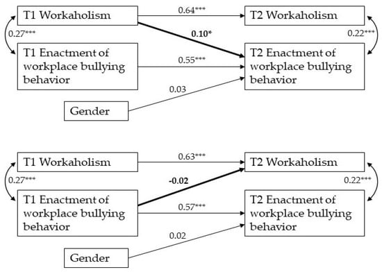Path analysis in Model 2 (above) and Model 3 (below) of the cross-lagged relationships between workaholism and enactment of workplace bullying behavior. * p < 0.05, *** p < 0.001.