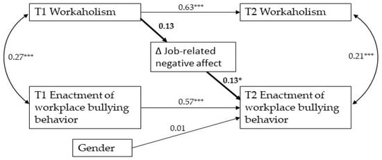 Subsequently, we tested H2, stating that job-related negative affect mediated the relationship between T1 workaholism and T2 enactment of bullying behavior. First, we estimated the baseline model for testing mediation (Model 4), which provided the following fit to the data (χ2(10) = 28.51, CFI = 0.923; TLI = 0.908; RMSEA = 0.089 [0.052–0.129]; SRMR = 0.074). We then fitted a further model (Model 5) which, in addition to the paths included in Model 4, included the path from T1 workaholism to Δ Job-related negative affect, and the path from Δ Job-related negative affect to T2 enactment of bullying. Model 5 fitted the data satisfactorily (χ2(8) = 19.29, CFI = 0.953; TLI = 0.930; RMSEA = 0.078 [0.033–0.123]; SRMR = 0.044) and, according to the Satorra and Bentler scaled χ2 difference test, significantly better than Model 4 (χ2(2) = 8.26, p = 0.002). Nevertheless, as shown in Figure 2, although the path from Δ Job-related negative affect to T2 enactment of workplace bullying behavior was statistically significant (std. path = 0.13, t(1) = 2.34, p < 0.05), the path from T1 workaholism to Δ Job-related negative affect was not (std. path = 0.13, t(1) = 1.78, p = 0.08), implying that the preconditions for testing mediated relationships were not met. Therefore, these results did not support H2.