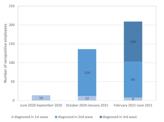 Over the observational period of one year, the seroprevalence rate against SARS-CoV-2 increased continuously from 1.1% in the first, to 13.2% in the second, and to 29.3% in the third pandemic wave, respectively. Altogether, 360 of 2990 tests (12.0%) were seropositive in the three observational periods, including multiple tests of employees from wave to wave. In Figure 1 the number of already known seropositive employees and newly diagnosed seropositive employees is illustrated for the three time periods. Taking multiple tests out, 243/1841 employees were tested seropositive at least once within the year of observation which represents a total seroprevalence of 13.2%. There were differences between the four working areas (hospitals and fire brigade): 133/858 of employees (15.5%) were positive in VHD, 59/319 (18.5%) in LSW, 35/522 (6.7%) in VKJ, and 13/103 (12.6%) in an associated fire brigade, respectively.